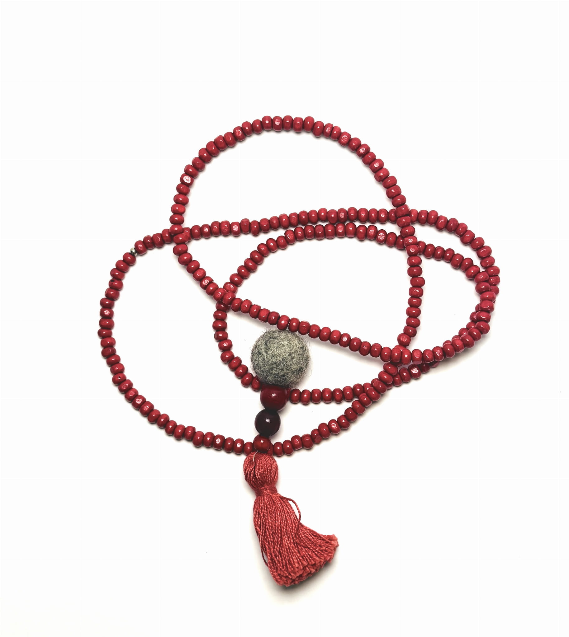Całkowita długość naszyjnika - 55 cm, długość zawieszki (filcowa kula i chwost oraz dwie czerwone kulki) - 10 cm.