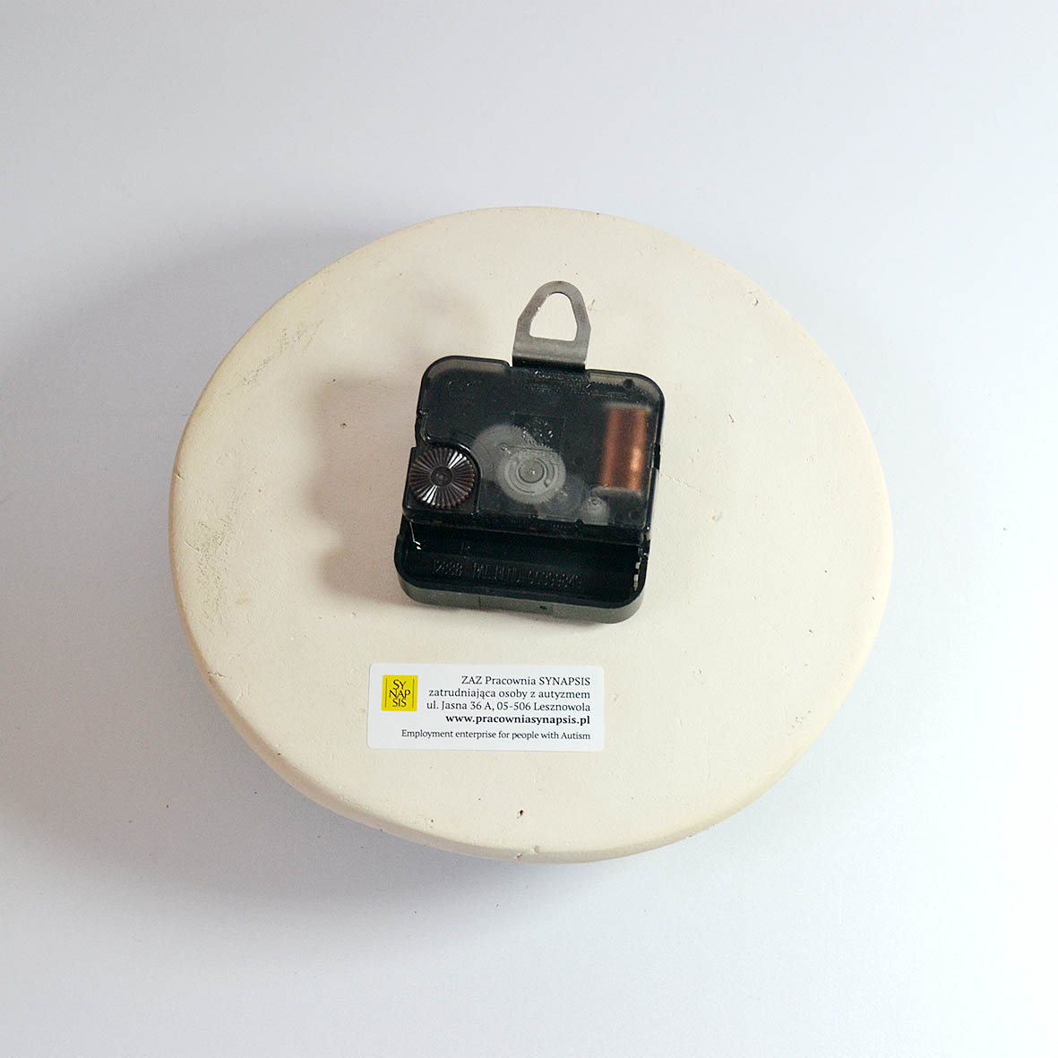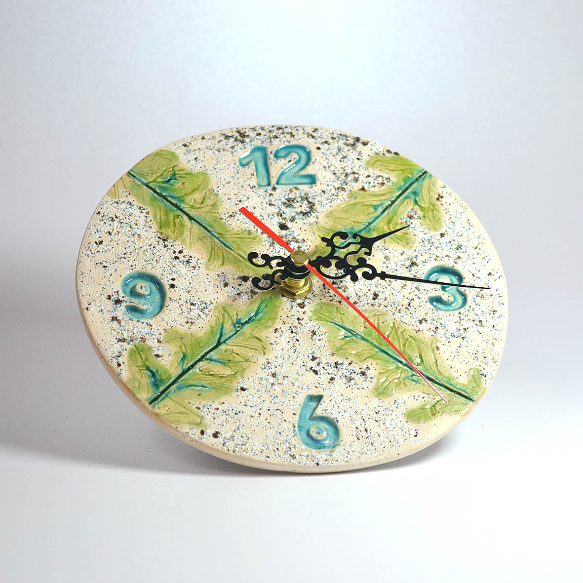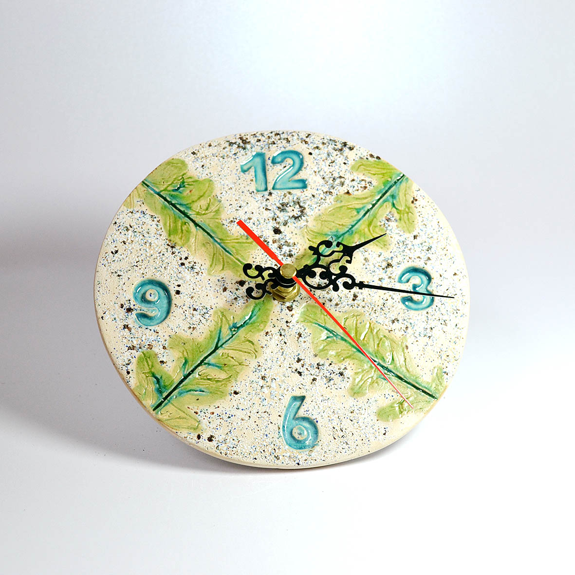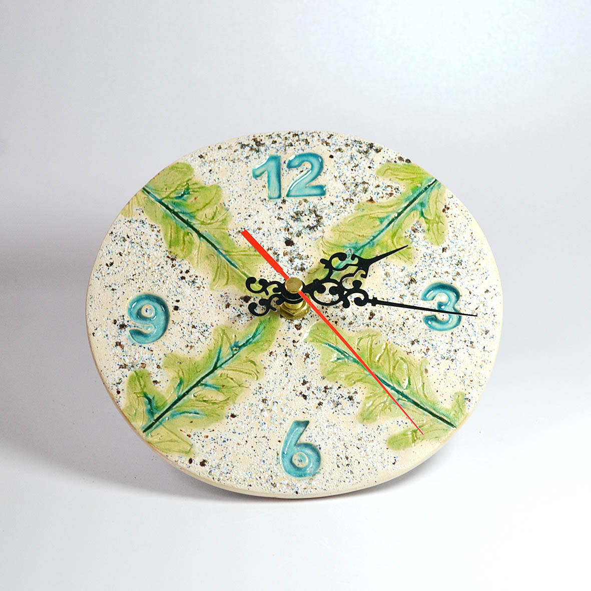Zegar ceramiczny ręcznie wykonany z jasnej gliny z ozdobnym wzorem liści.